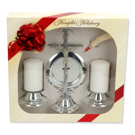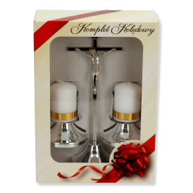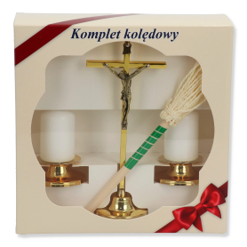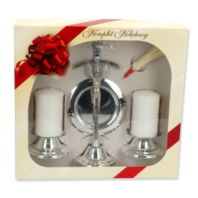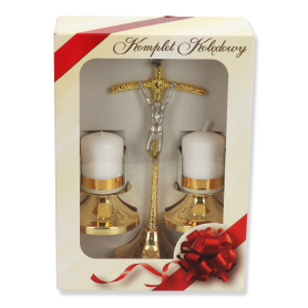 Wymiary: Krzyż: h-26cm / spodek: 12,5cm / kropidło: h-20cm / świecznik ze świecą: 12,5cm