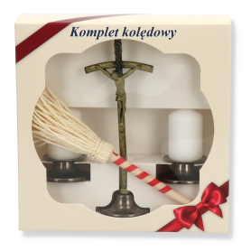 Wymiary: Krzyż: h-17cm/ kropidło: h-20cm / świecznik ze świecą: 7,5cm